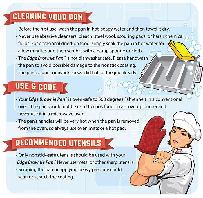 (Tip for Edge pans: We recommend using a soap-dispensing dishwashing wand with a soft sponge at the end of the handle. Most sponge heads fit perfectly between the pan’s interior sidewalls.)